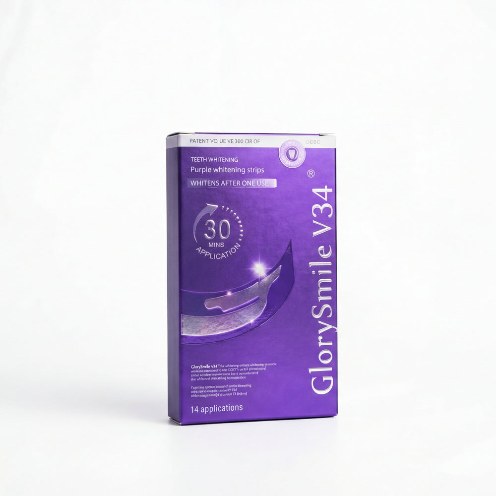 The VioletSmile™ v34 GlorySmile teeth whitening strips are premium high quality whiteners produced to cancel out yellow& brown shades in your teeth for instant pearly white results, with even better results from consistent use. It breaks down oxygen to react with stain molecules on the enamel using Hydrogen Peroxide to painlessly remove stains from food, drinks and smoking. Making sure to never slip off your teeth for the best quality experience